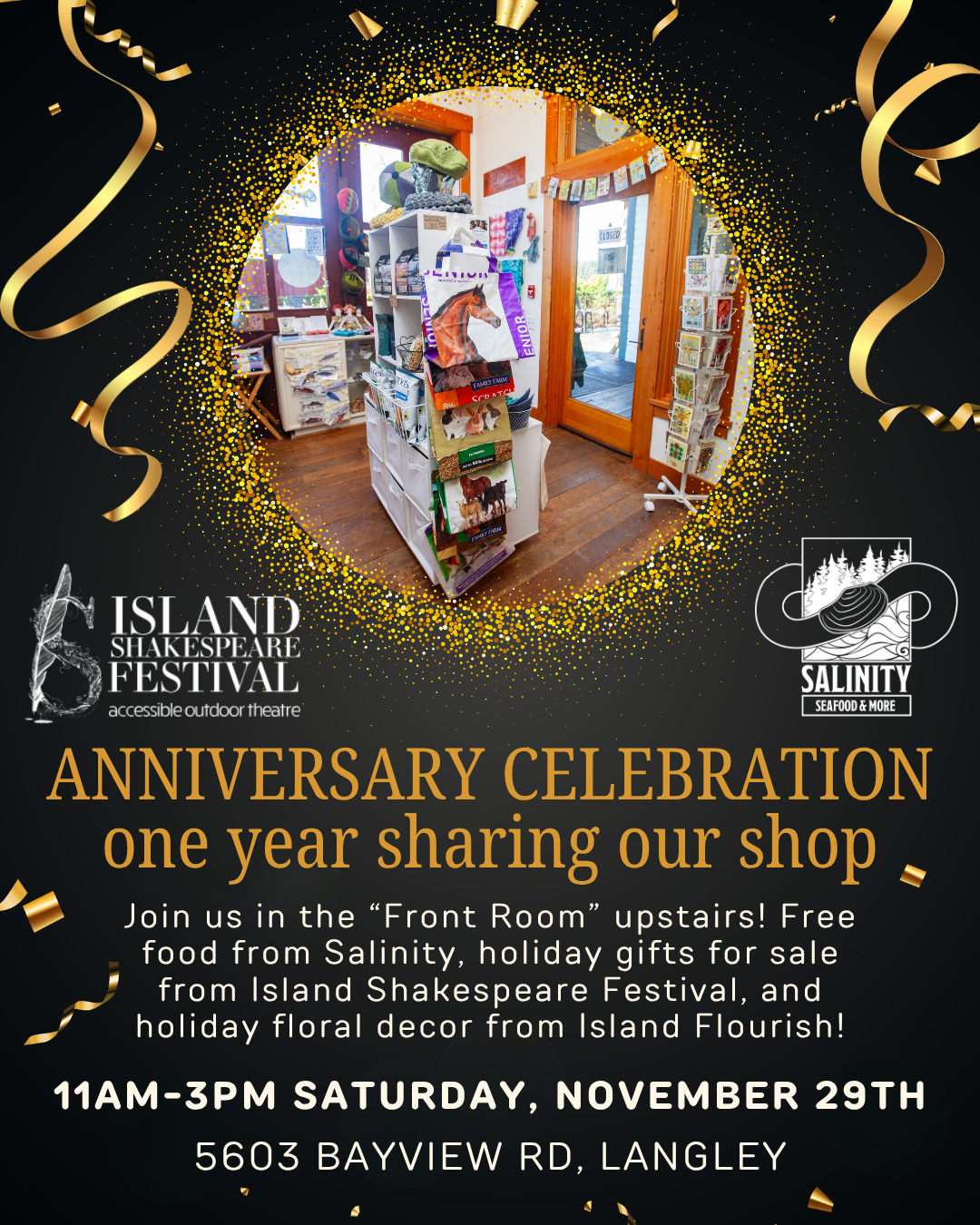 Join us in the “Front Room” upstairs to celebrate one year sharing our shop! Free food from Salinity, holiday gifts from Island Shakespeare Festival, and holiday floral decor from Island Flourish!