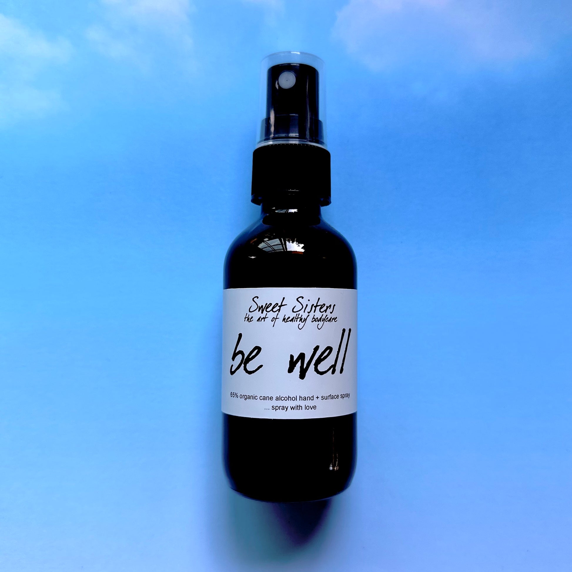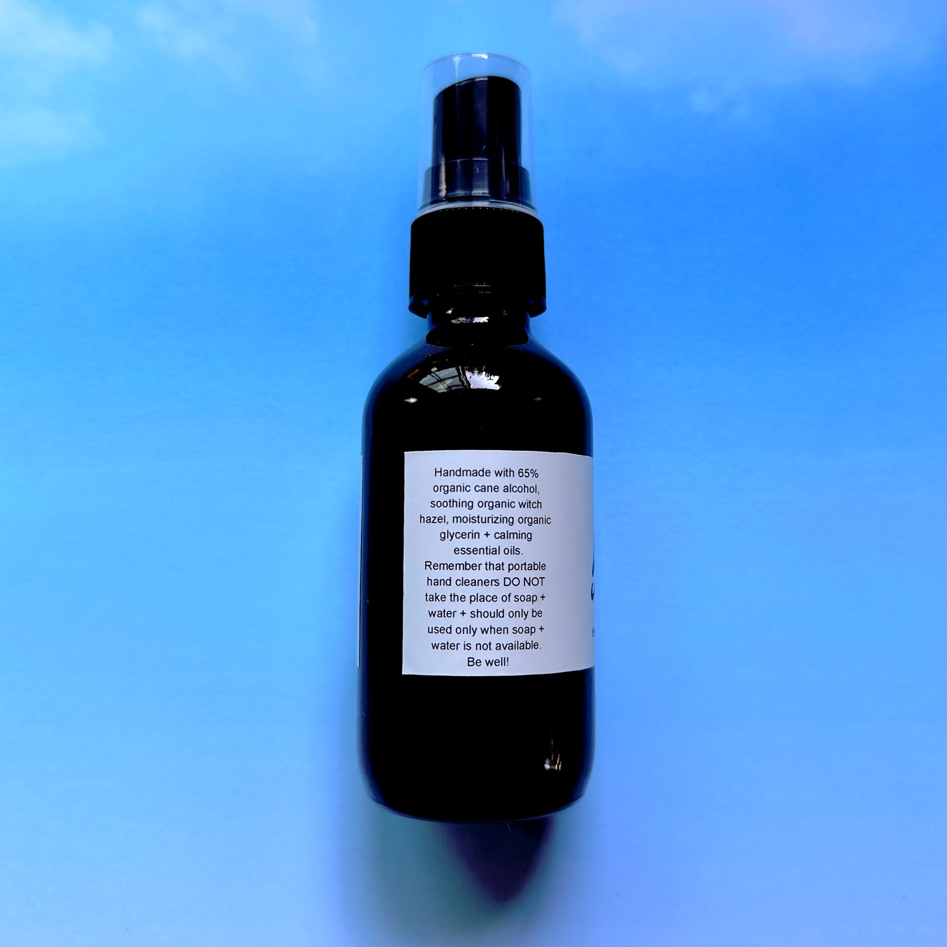 Sanitizing spray for your hands or for cleaning surfaces like yoga mats (test surfaces for compatibility first). Made with 65% 190 proof organic perfume alcohol. This spray is soothing and mildly moisturizing thanks to the addition of organic vegetable glycerin and anti-anxiety essential oils from lavender, sweet orange, patchouli, and vanilla. Not a replacement for washing your hands with soap and water.