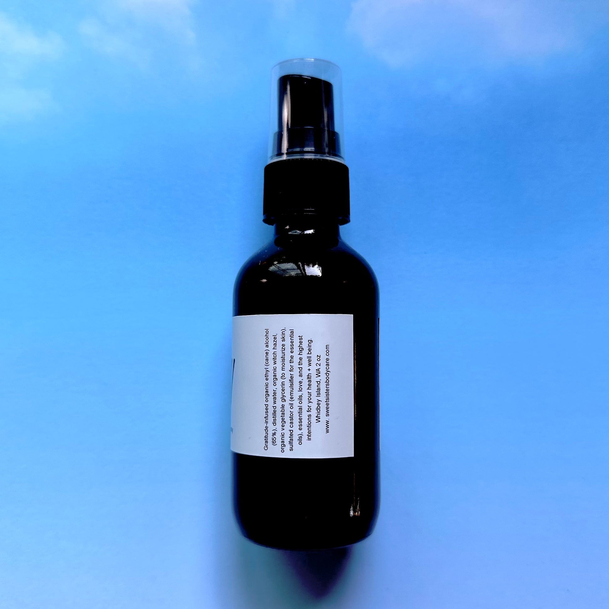 Ingredients: Organic Ethyl (Cane) Alcohol (65%), Distilled Water, Organic Witch Hazel, Organic Vegetable Glycerin (to moisturize skin), Sulfated Castor Oil (emulsifier for the essential oils), Essential Oils (Bulgarian lavender, sweet orange, patchouli, and vanilla)