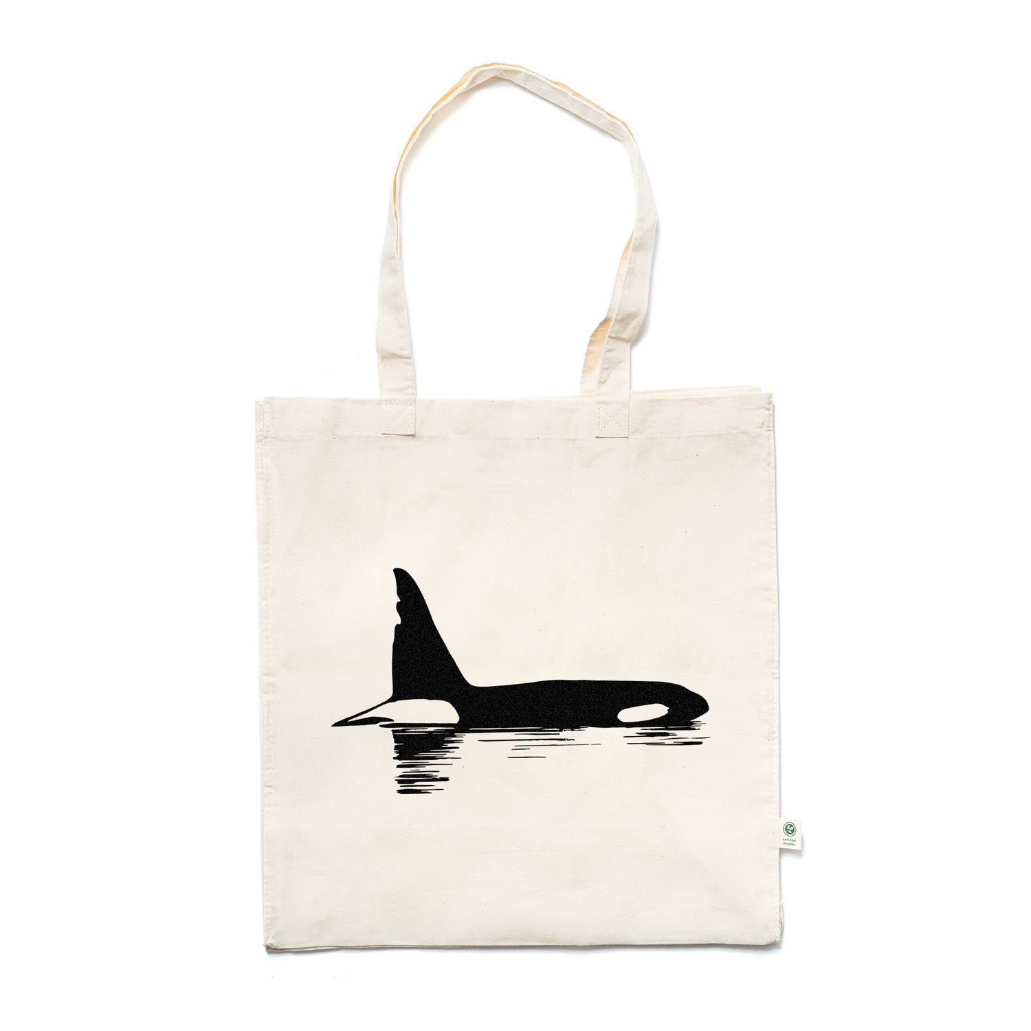 An organic cotton tote bag printed with a gorgeous depiction of one of Puget Sound's local orca "killer whales" named Chainsaw.