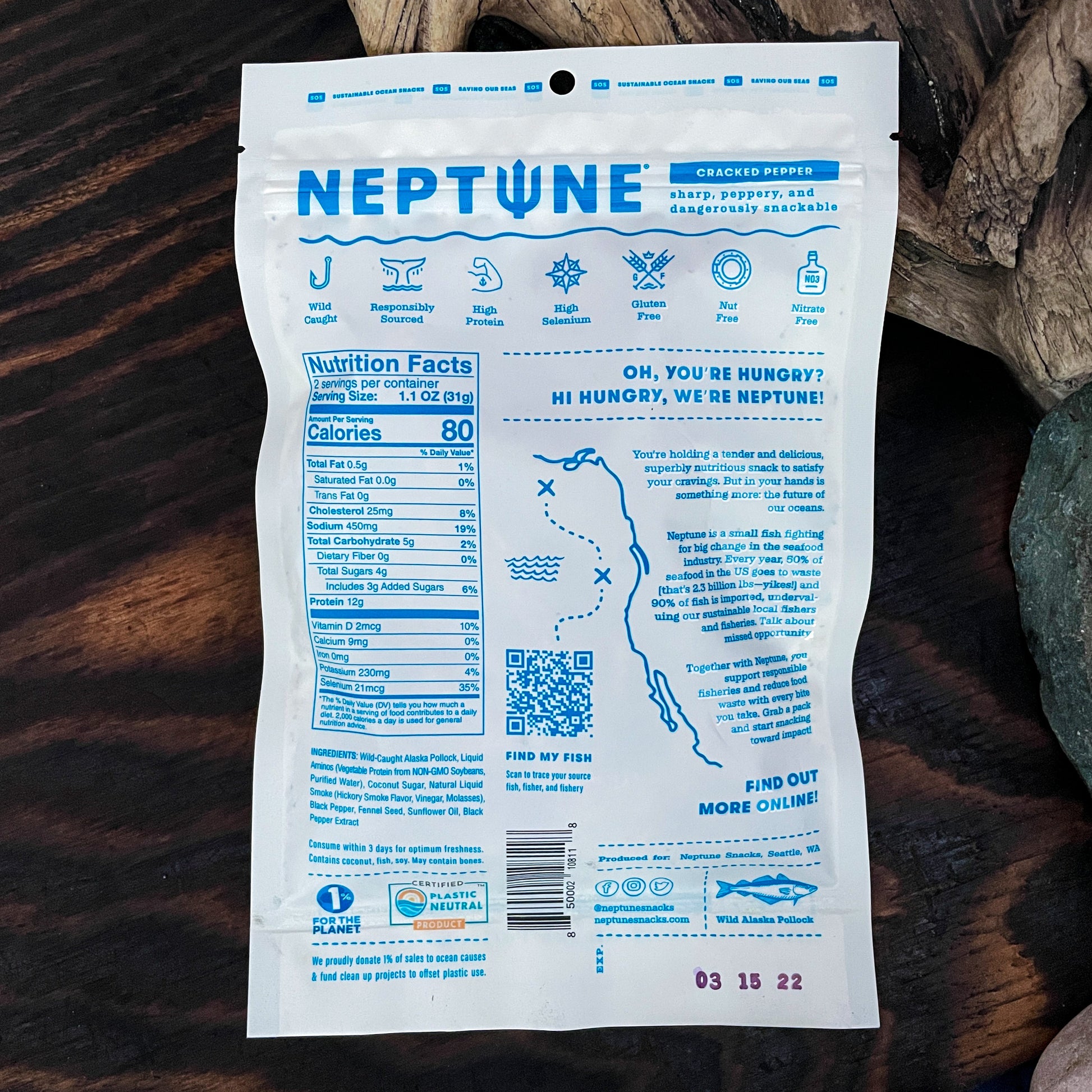 Ingredients: Wild-Caught Alaska Pollock, Liquid Aminos (Vegetable Protein from NON-GMO Soybeans, Purified Water), Coconut Sugar, Natural Liquid Smoke (Hickory Smoke Flavor, Vinegar, Molasses), Black Pepper, Fennel Seed, Sunflower Oil, Black Pepper Extract