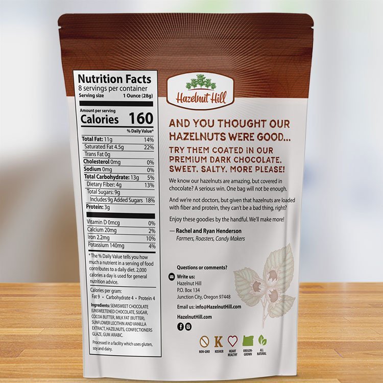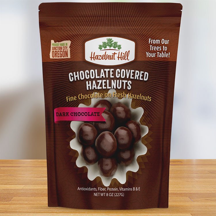 Enjoy a bag of delicious dark chocolate covered freshly roasted hazelnuts, a snack made from nuts grown in Oregon. Discover the perfect blend of crunchy hazelnuts and premium Guittard dark chocolate, expertly crafted for endless snacking. Satisfy your sweet and salty cravings!