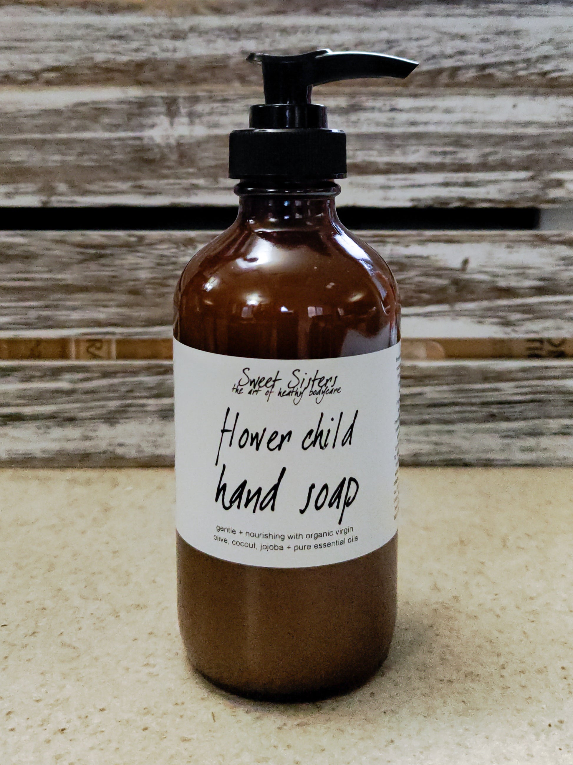Glass bottle of gorgeous flowery “Flower Child” hand soap handcrafted from 100% organic plant oils and scented with pure essential oils extracted only with steam or CO2, not toxic solvents. This Whidbey Island company combines quality vegan ingredients using a hot-process soapmaking method that retains all of moisturizing properties. The result is a gentle soap that is cleansing and very soothing to the skin. Pamper your skin with soap that smells like a beautiful summer’s day!