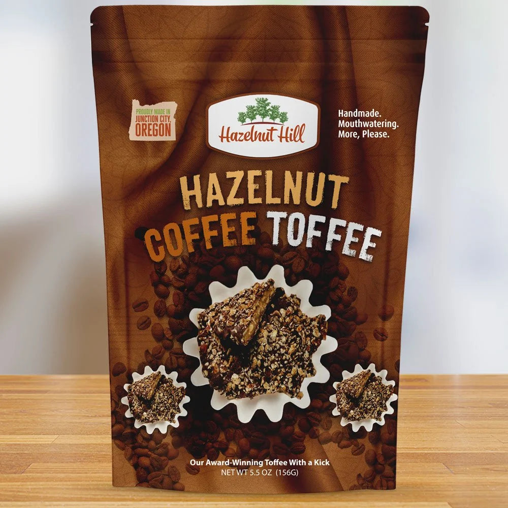 Decadent toffee made from Oregon-grown hazelnuts and chocolate, then dusted with ground coffee beans! The classic crunch and buttery taste is heavenly. These beautiful honey-colored bars are made in small batches and coated with the finest dark chocolate and Hazelnut Hill hazelnuts.