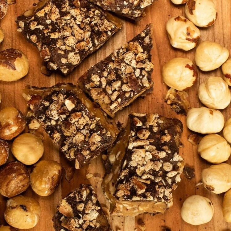 Decadent toffee made from Oregon-grown hazelnuts and chocolate! The classic crunch and buttery taste is heavenly. These beautiful honey-colored bars are made in small batches and coated with the finest dark chocolate and Hazelnut Hill hazelnuts.