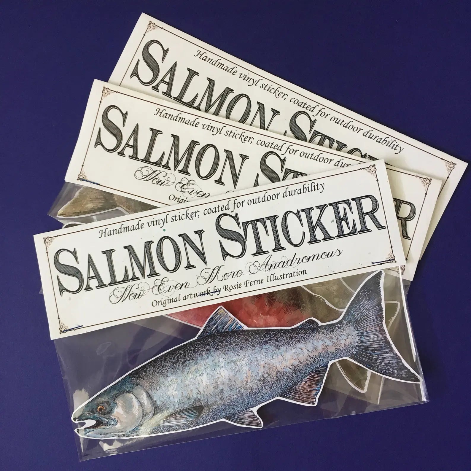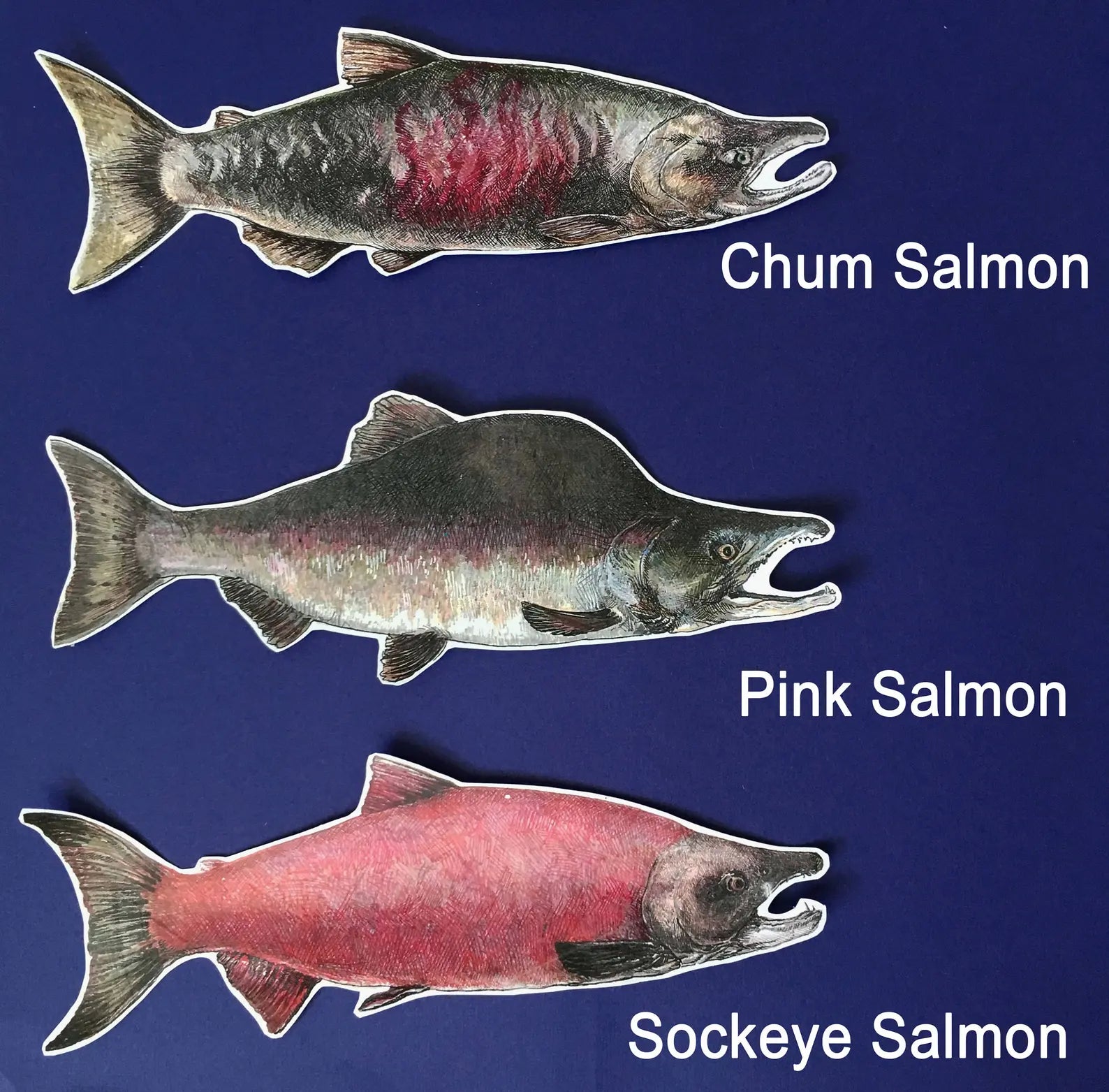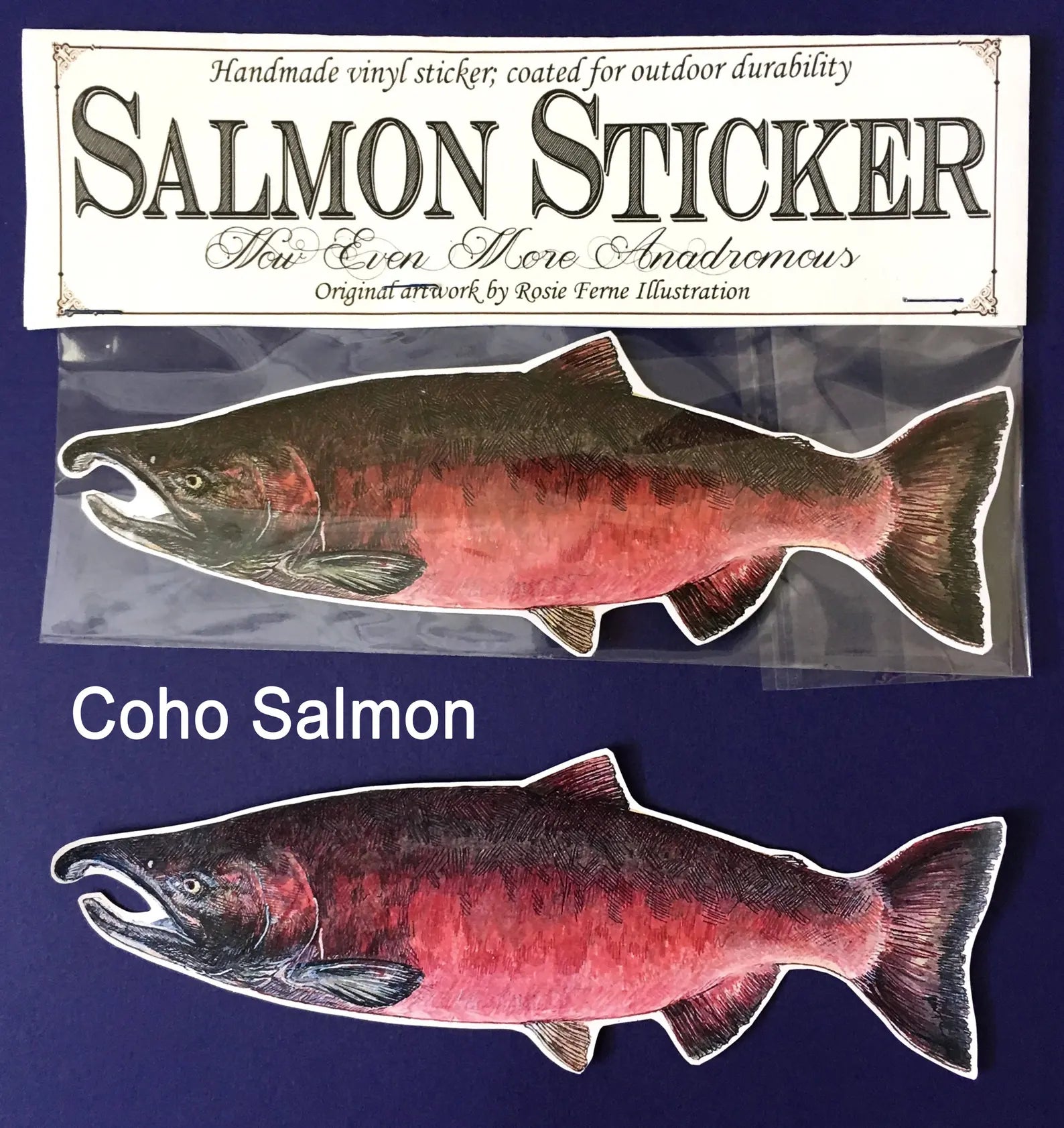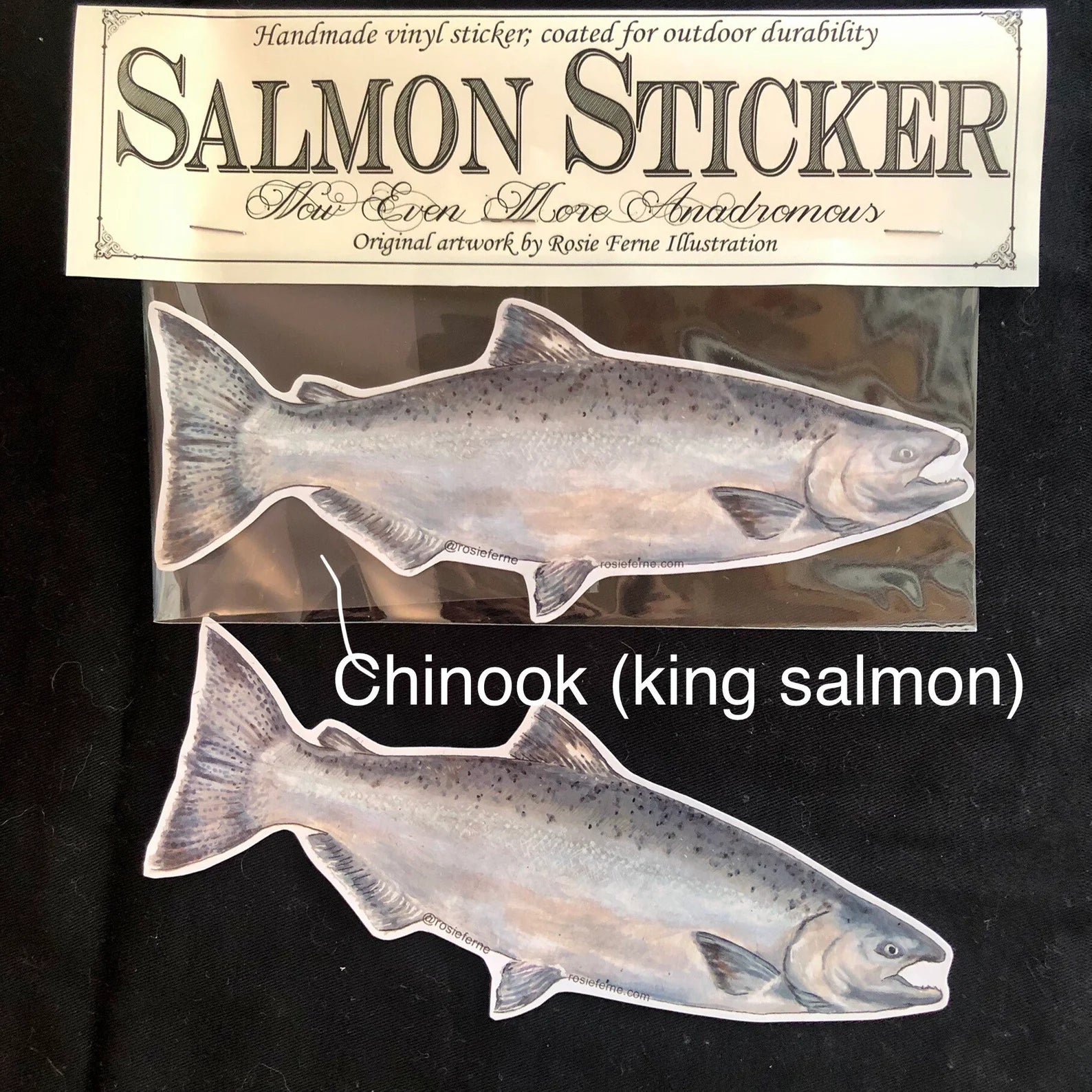 These salmon stickers are handmade by Rosie Ferne, an amazing artist in Poulsbo, Washington. Please choose from Chinook/King (shown in the silver-colored ocean phase of its life), Coho salmon, Sockeye salmon, Pink (Humpy) salmon, or Chum (Dog) salmon, all shown in their spawning phase colors.