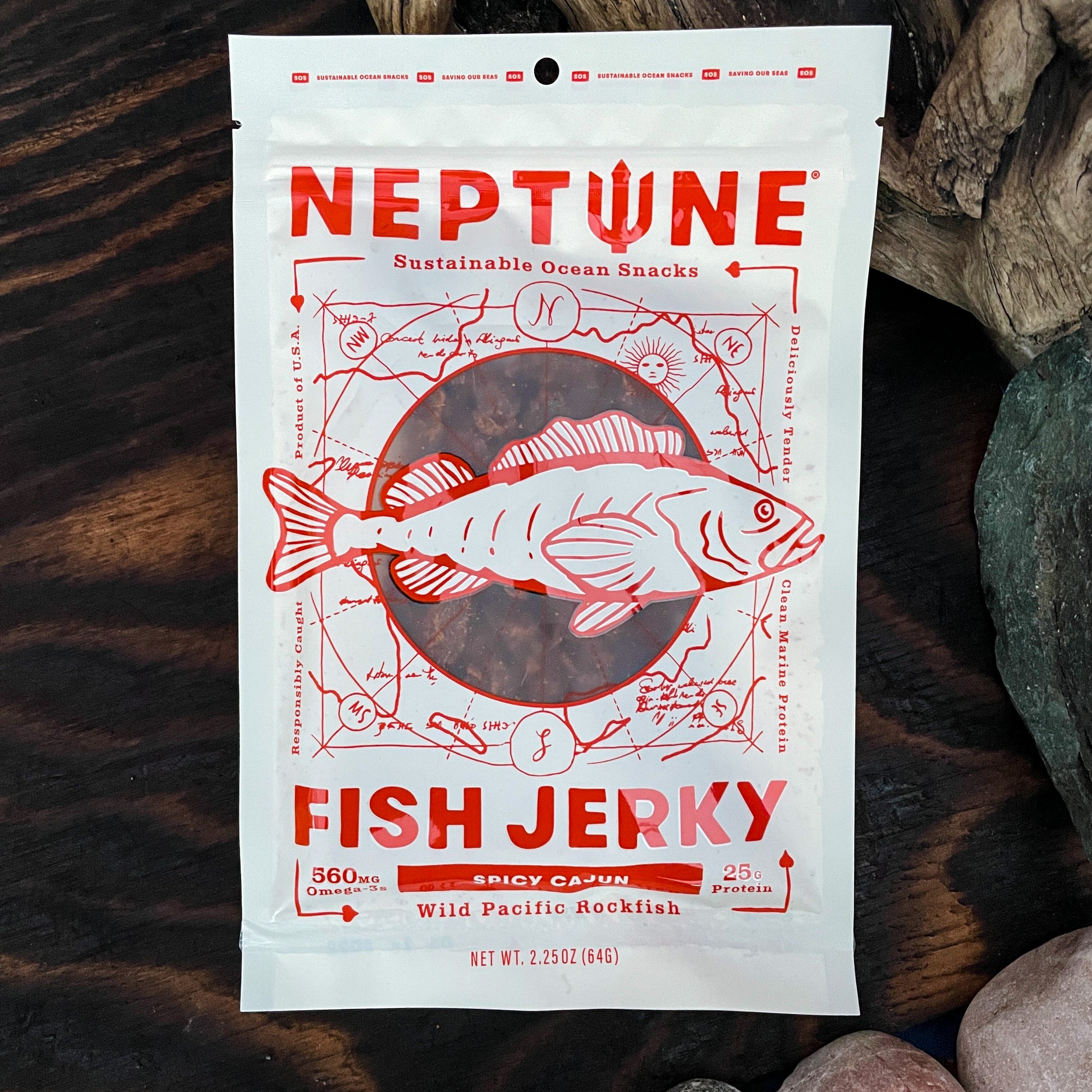 Wild-caught Pacific Rockfish dried to perfection and flavored with cayenne, peppers, paprika, garlic, and thyme. The perfect anytime spicy jerky!