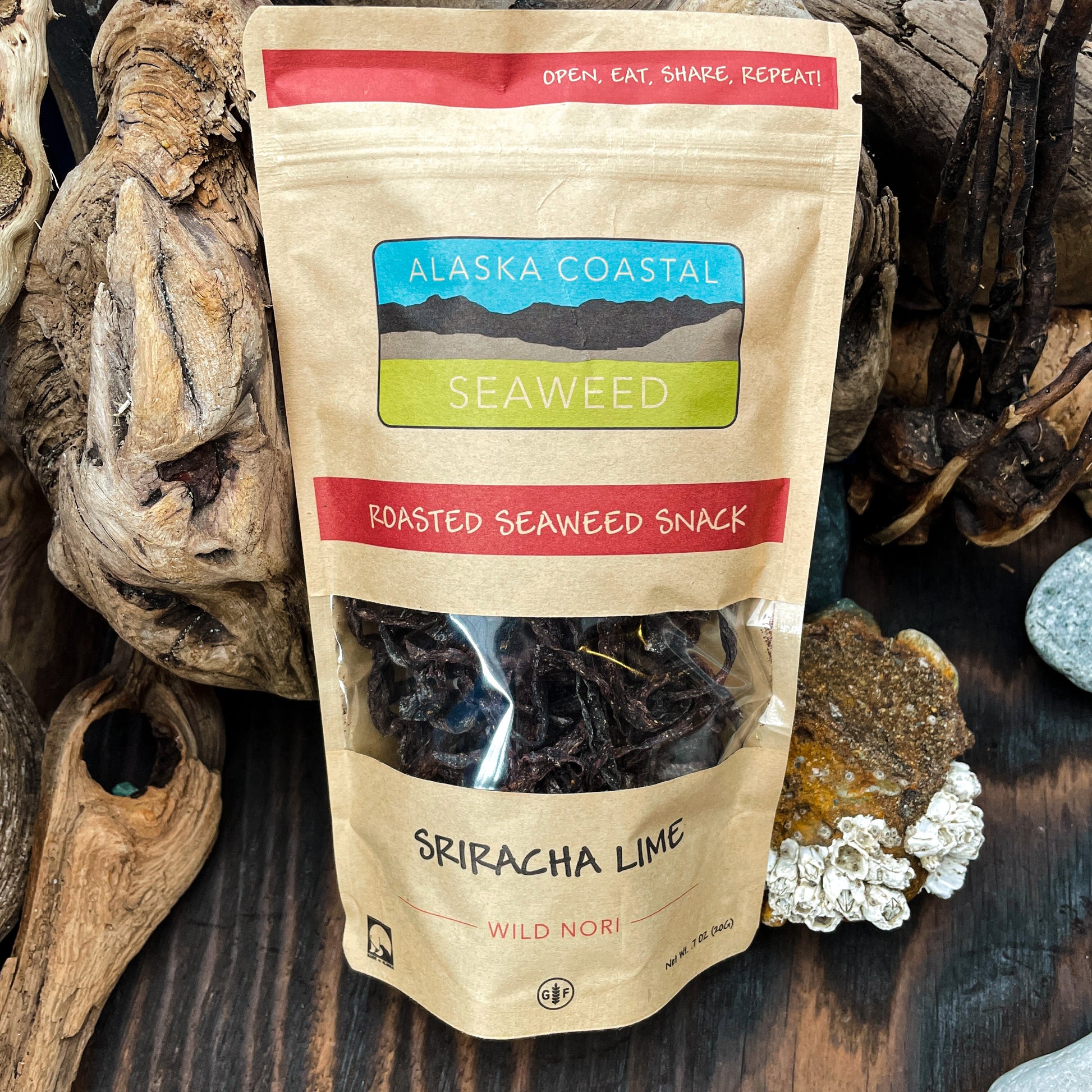 Twists of dried wild nori (Porphyra) sustainably harvested off the coast of southeast Alaska and smoked with alder wood. Perfect for snacking on! This is the (slightly spicy) Sriracha Lime flavor - other flavors available here.