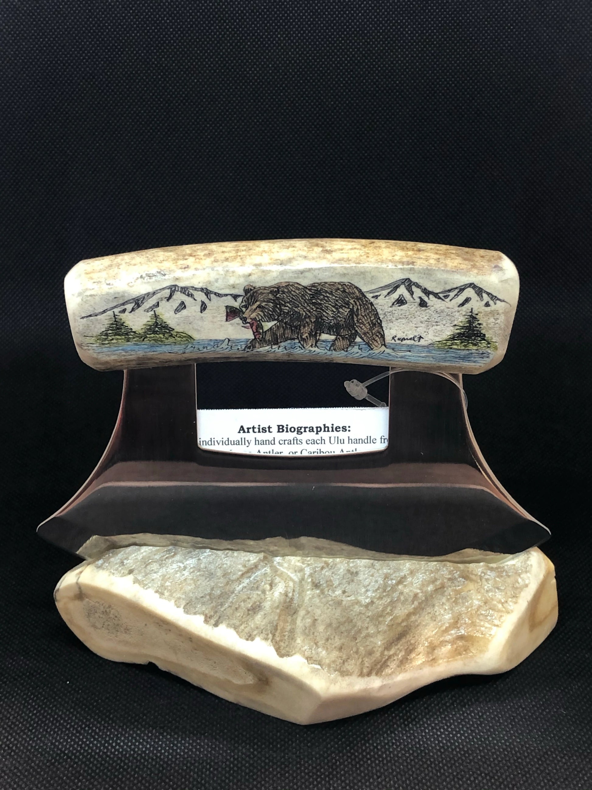 This ulu knife is decorated with a scrimshaw brown bear catching a fish, made by Alaskan artist Donna Wilcox.