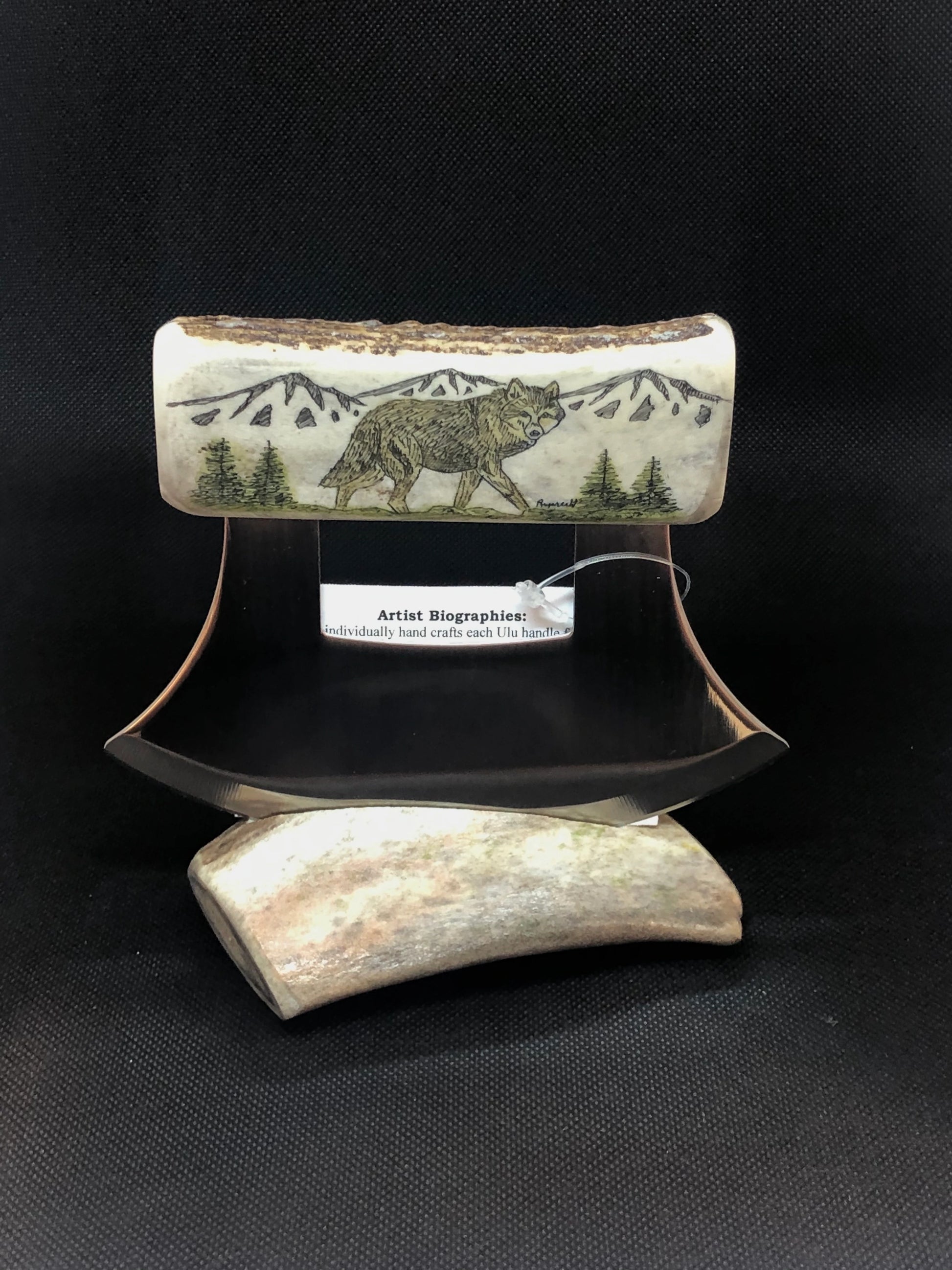 This ulu knife is decorated with a scrimshaw wolf, made by Alaskan artist Donna Wilcox.