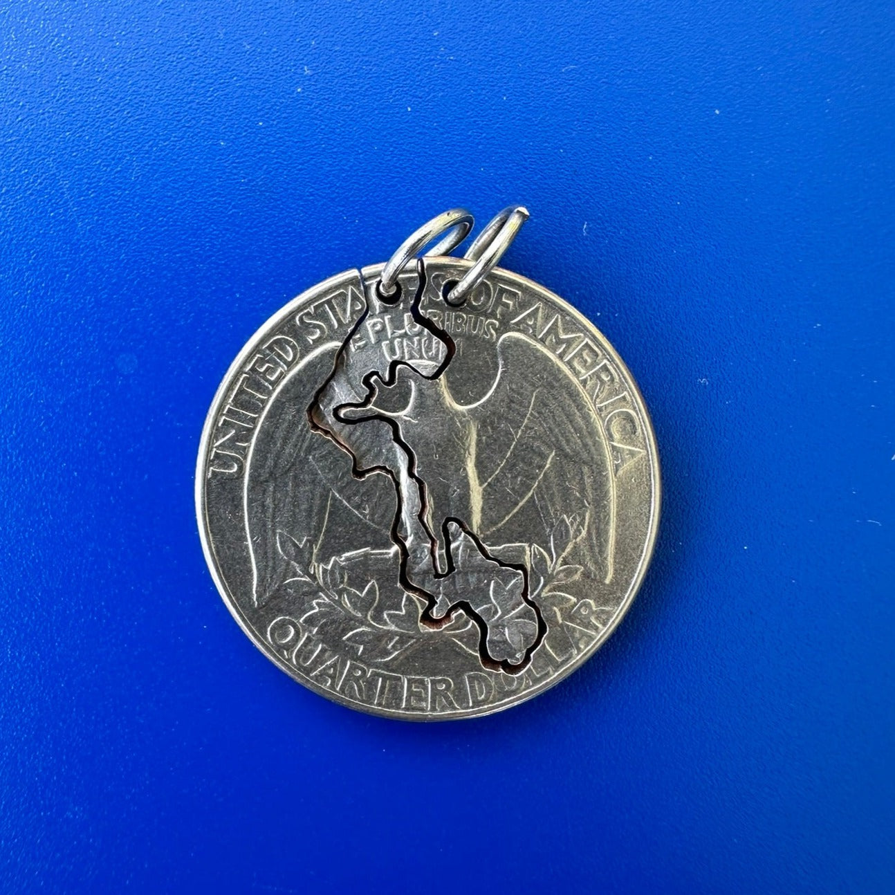 These necklaces are handmade on Whidbey Island from US quarters. Cut by hand (not lasers!) from coins to make unique jewelry! The edges are polished so nothing will catch on your clothes.