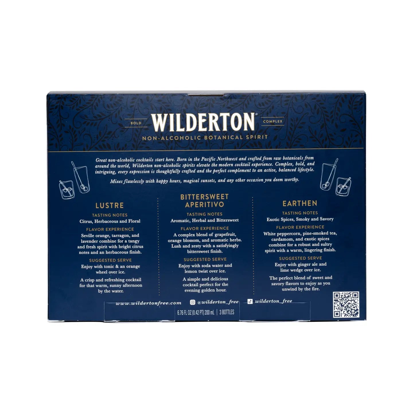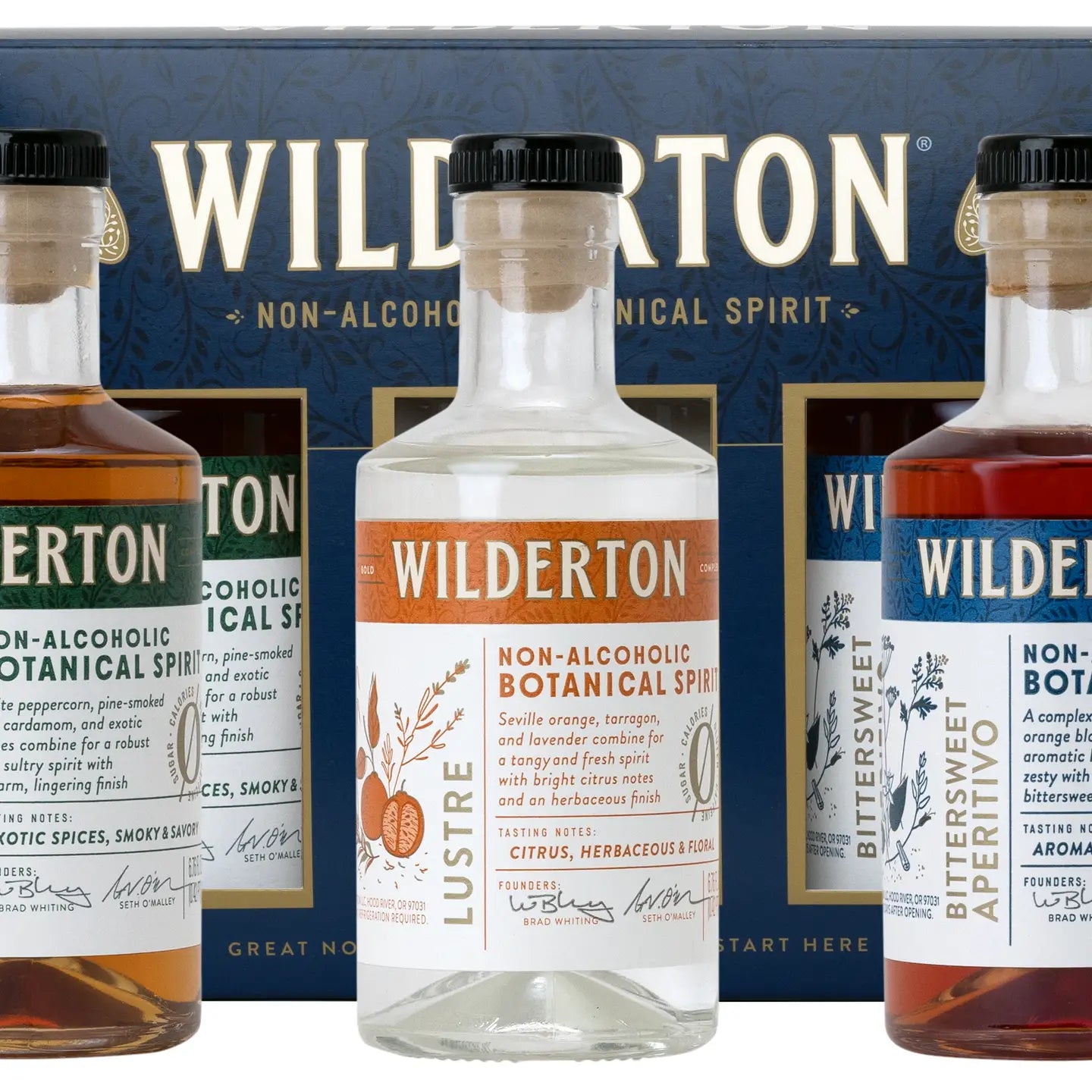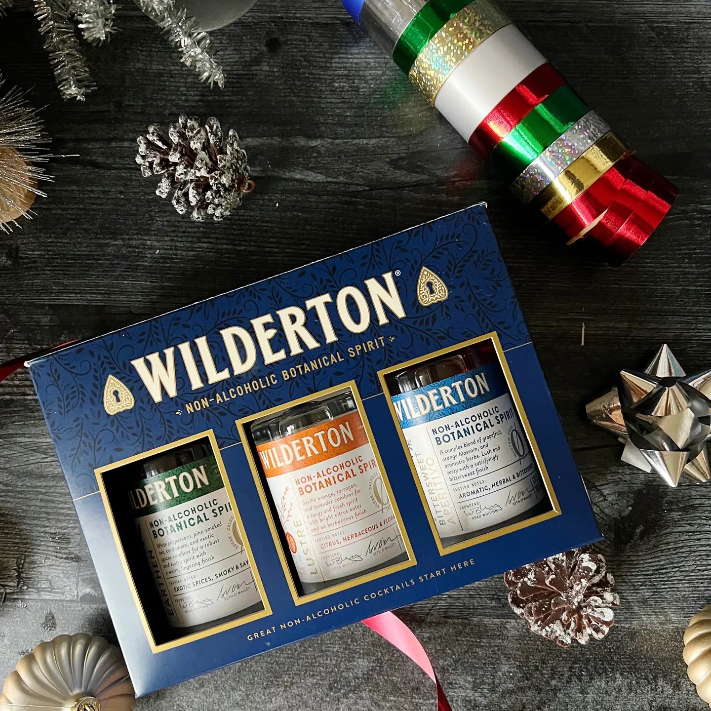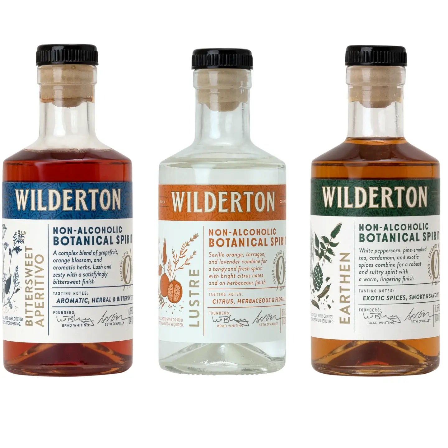 Enjoy Wilderton's nonalcoholic Lustre, Earthen, and Bittersweet Aperitivo in three 200ml btls - all in one beautiful gift box! Perfect for holidays, gifting, Mother's Day, Father's Day, Memorial Day, N/A non alcoholic, spring or summer. Use as a mixer or sip neat.