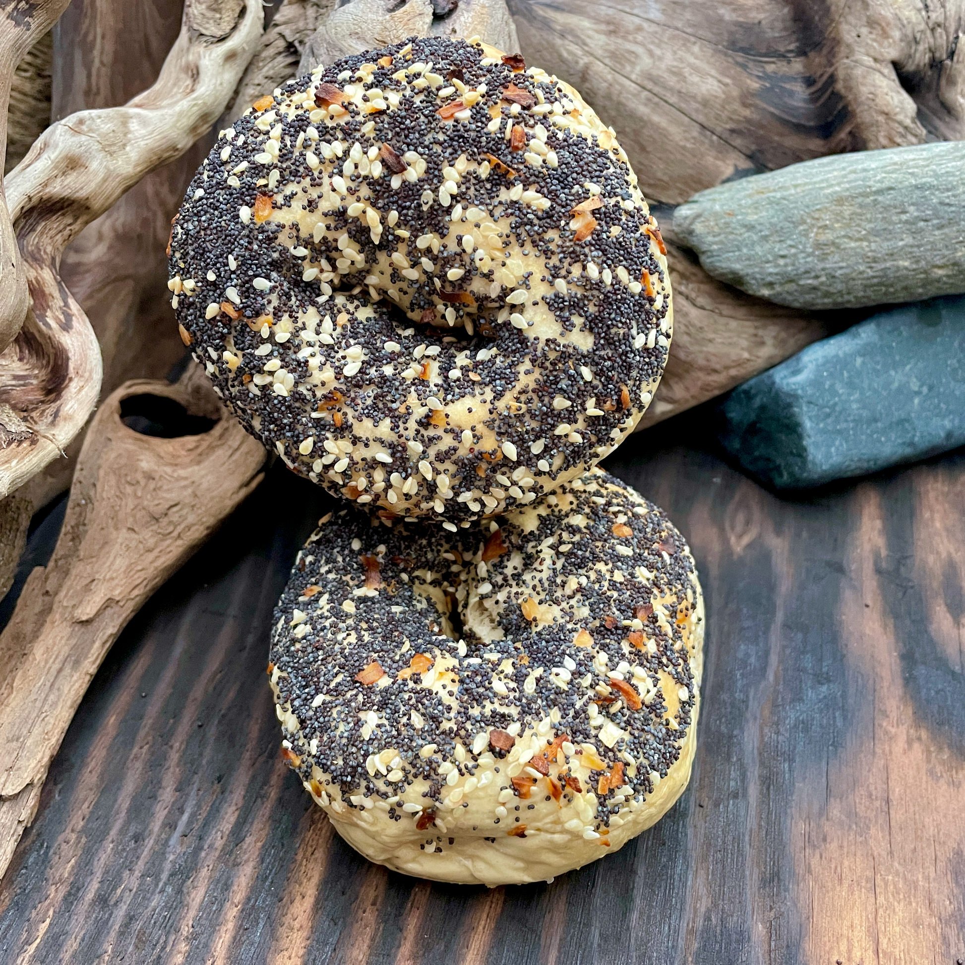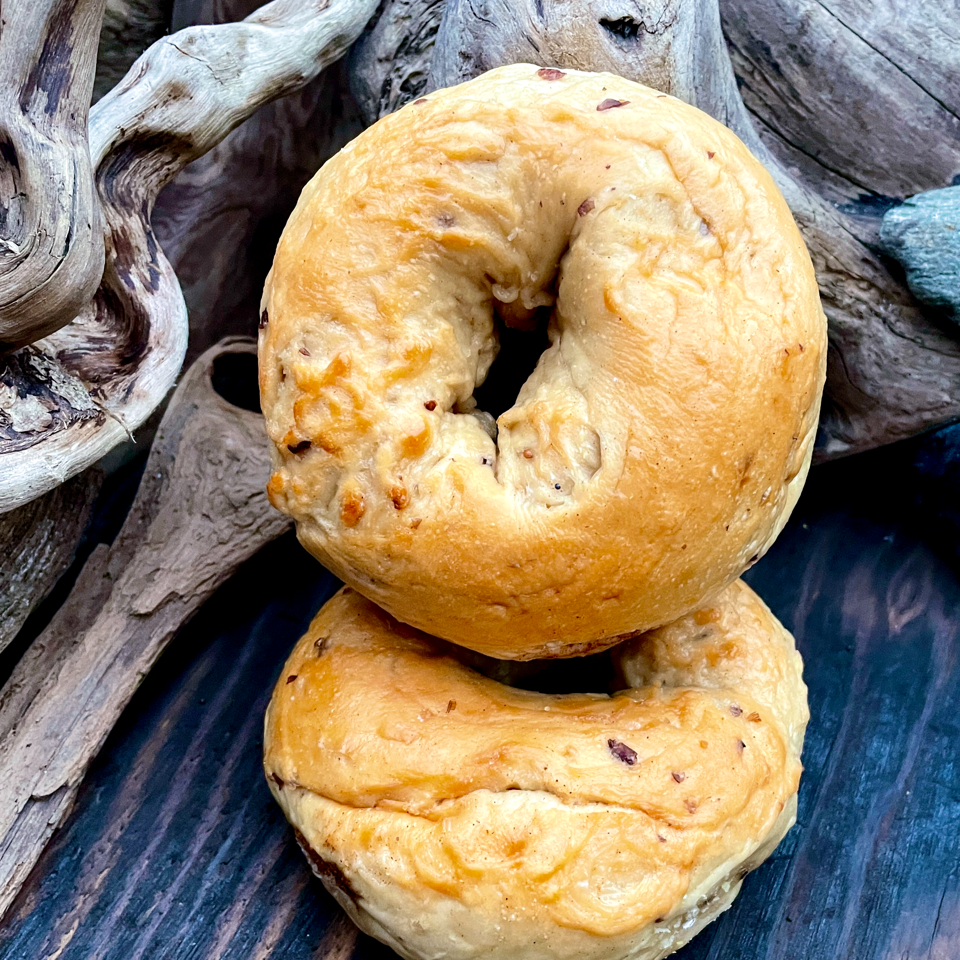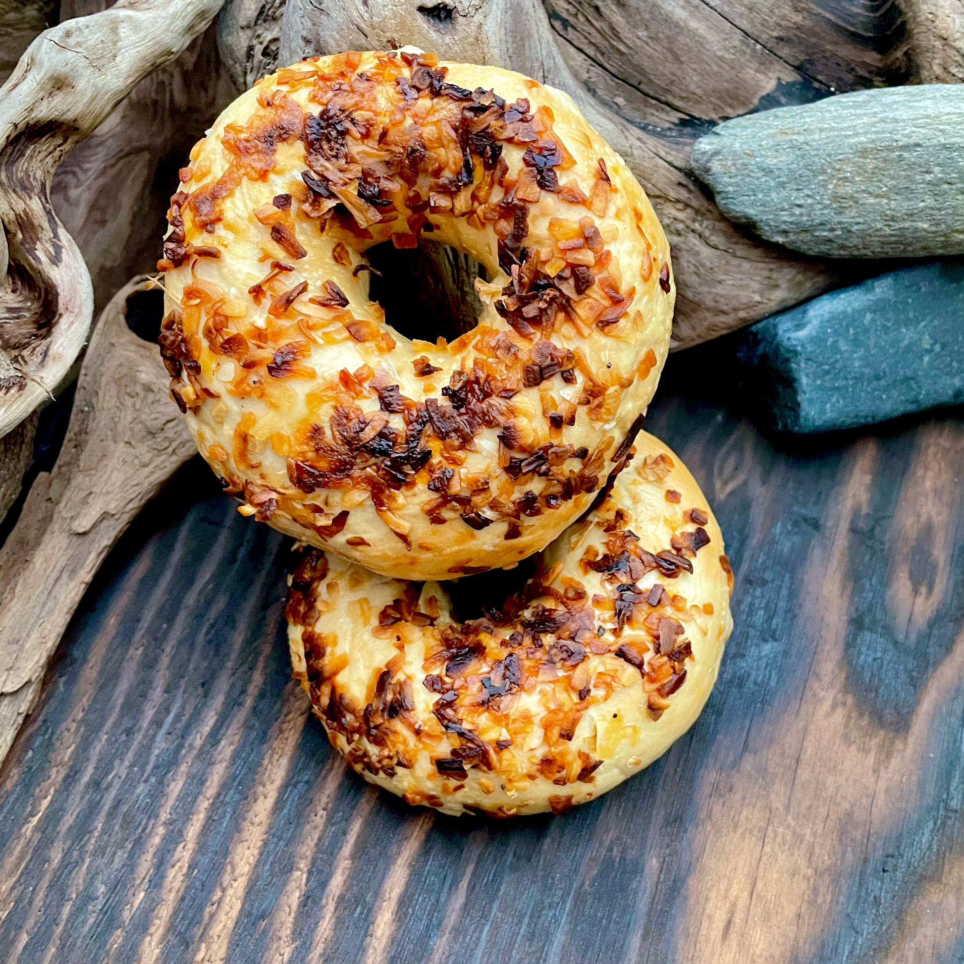 Ingredients: Trade secret. Contact us with specific concerns! Contains gluten. Egg-free. Some flavors contain dairy (anything with Parmesan or Cheese in the title). Vegan Bagel Options Here